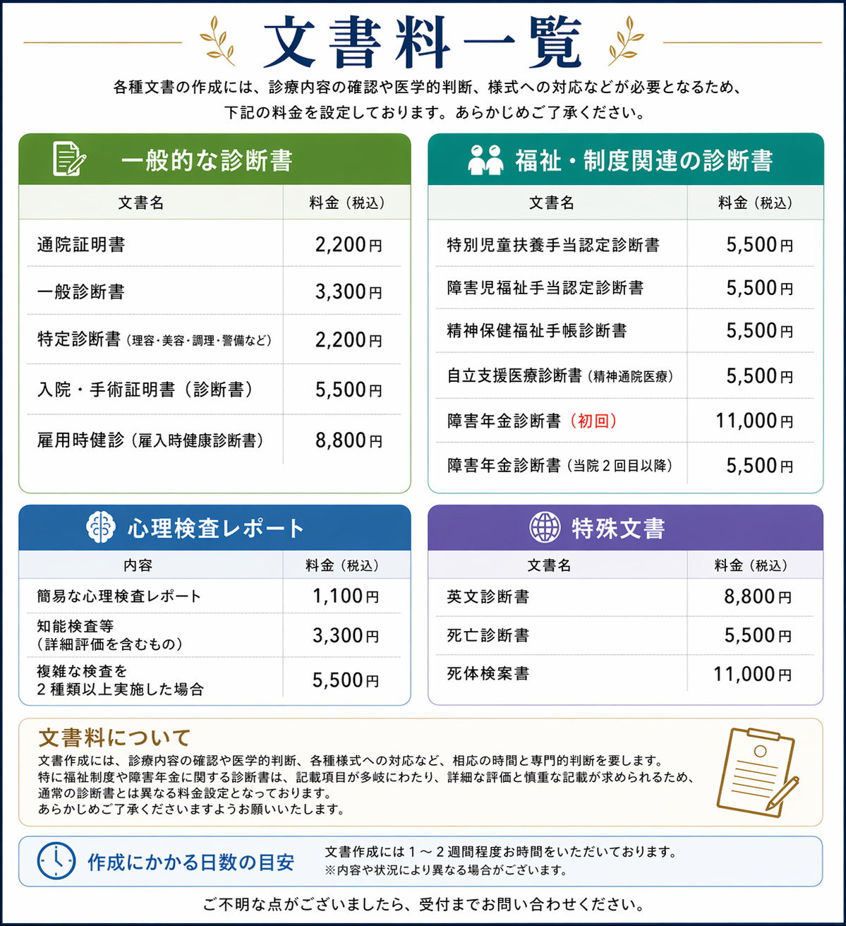 なお、文書の内容や診療状況により、作成にお時間をいただく場合がございます。あらかじめご了承ください。